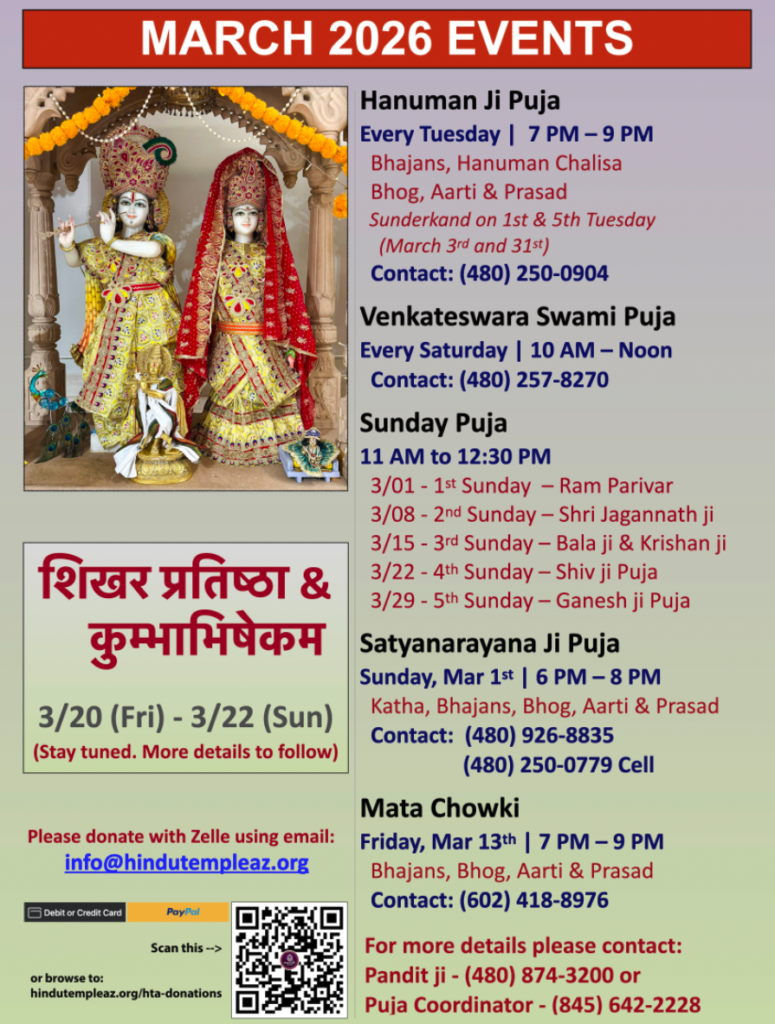 Our Vision: Build and maintain a Hindu Temple in Arizona, with multiple deities, with Shri Venkataeshwara, Shri Radha Krishna and Shri Ram Parivar as main deities with equal prominence, built per Hindu traditions.