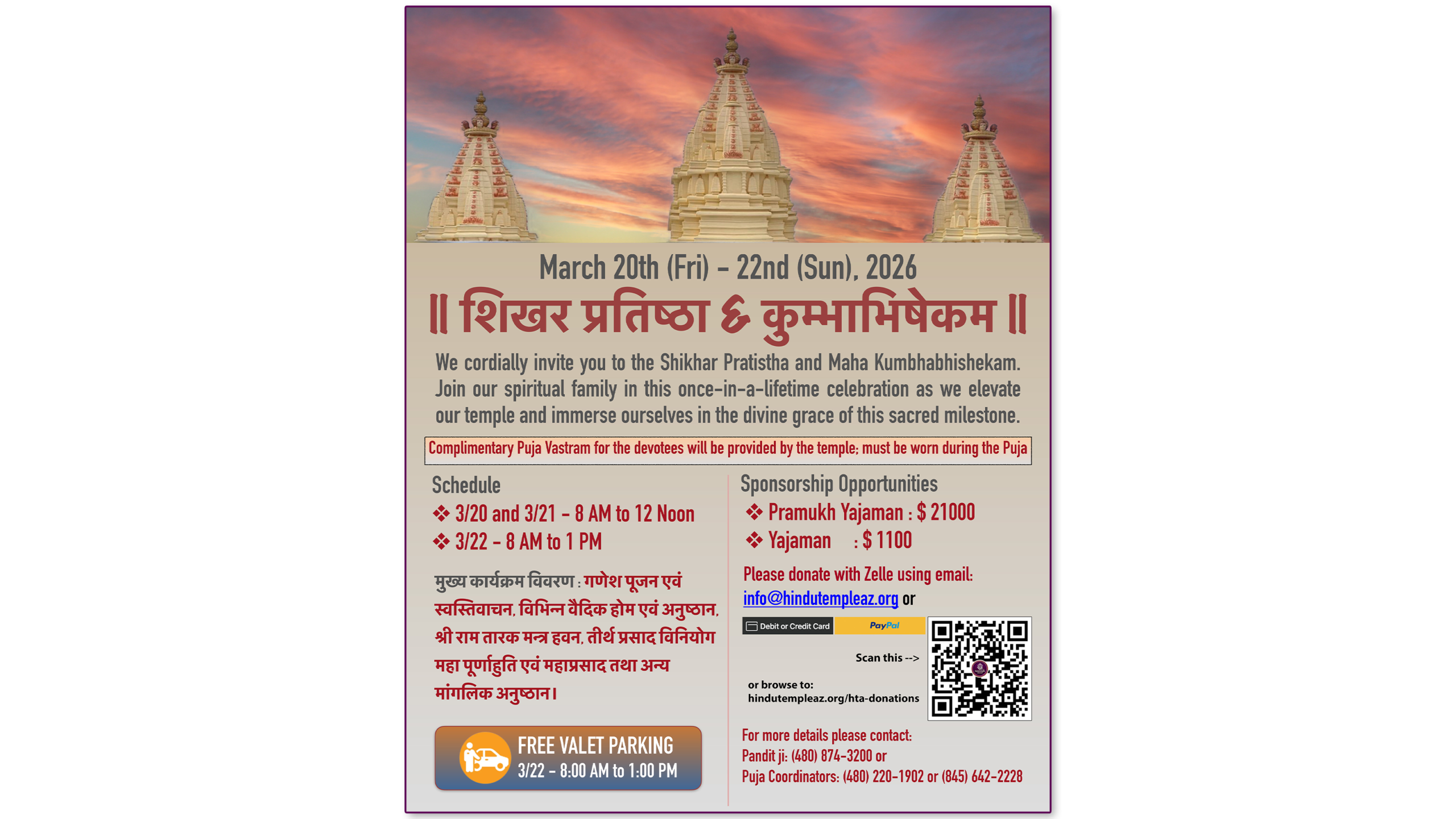 Bhajans, Bhog, Aarti & Prasad. Contact (602) 418-8976 for more details.